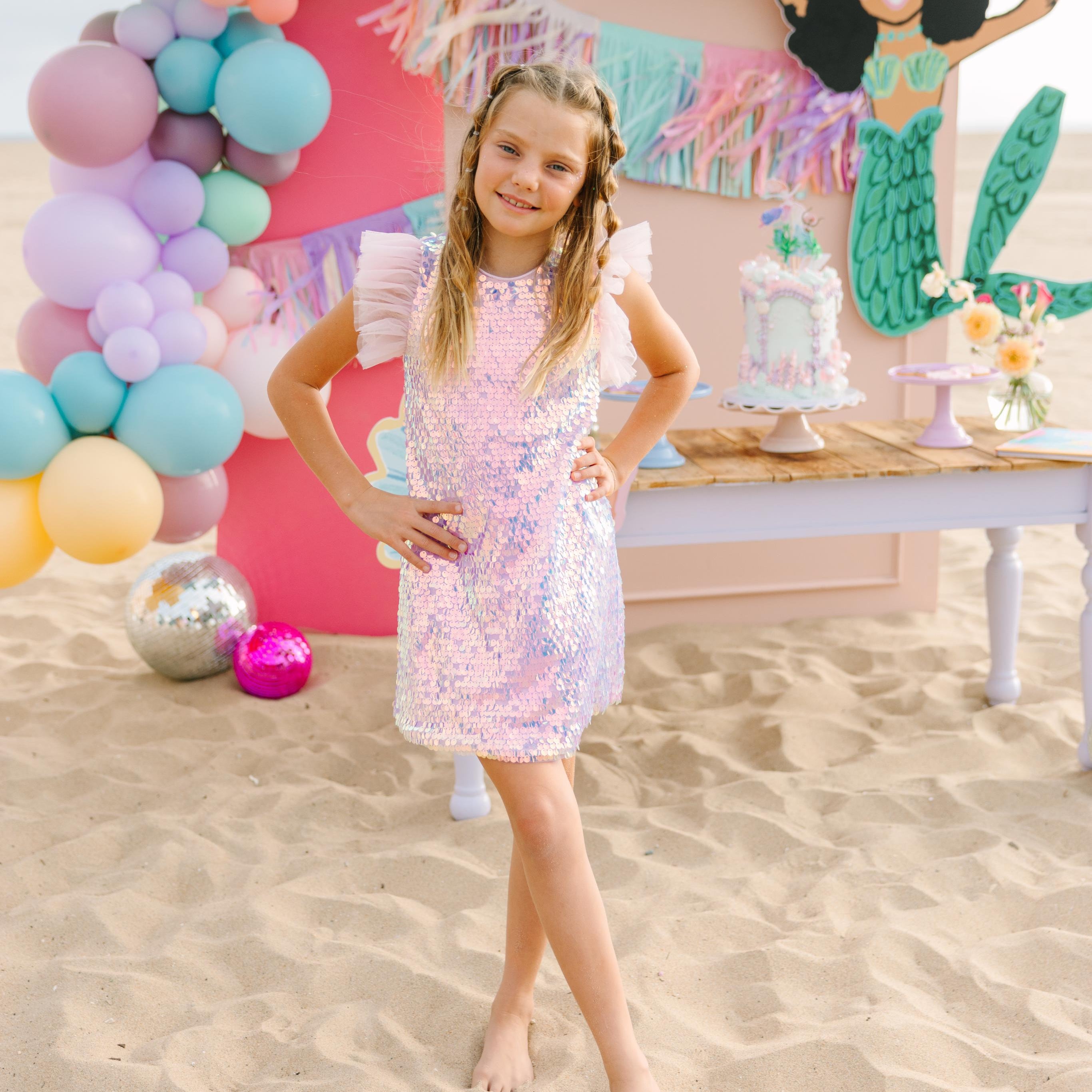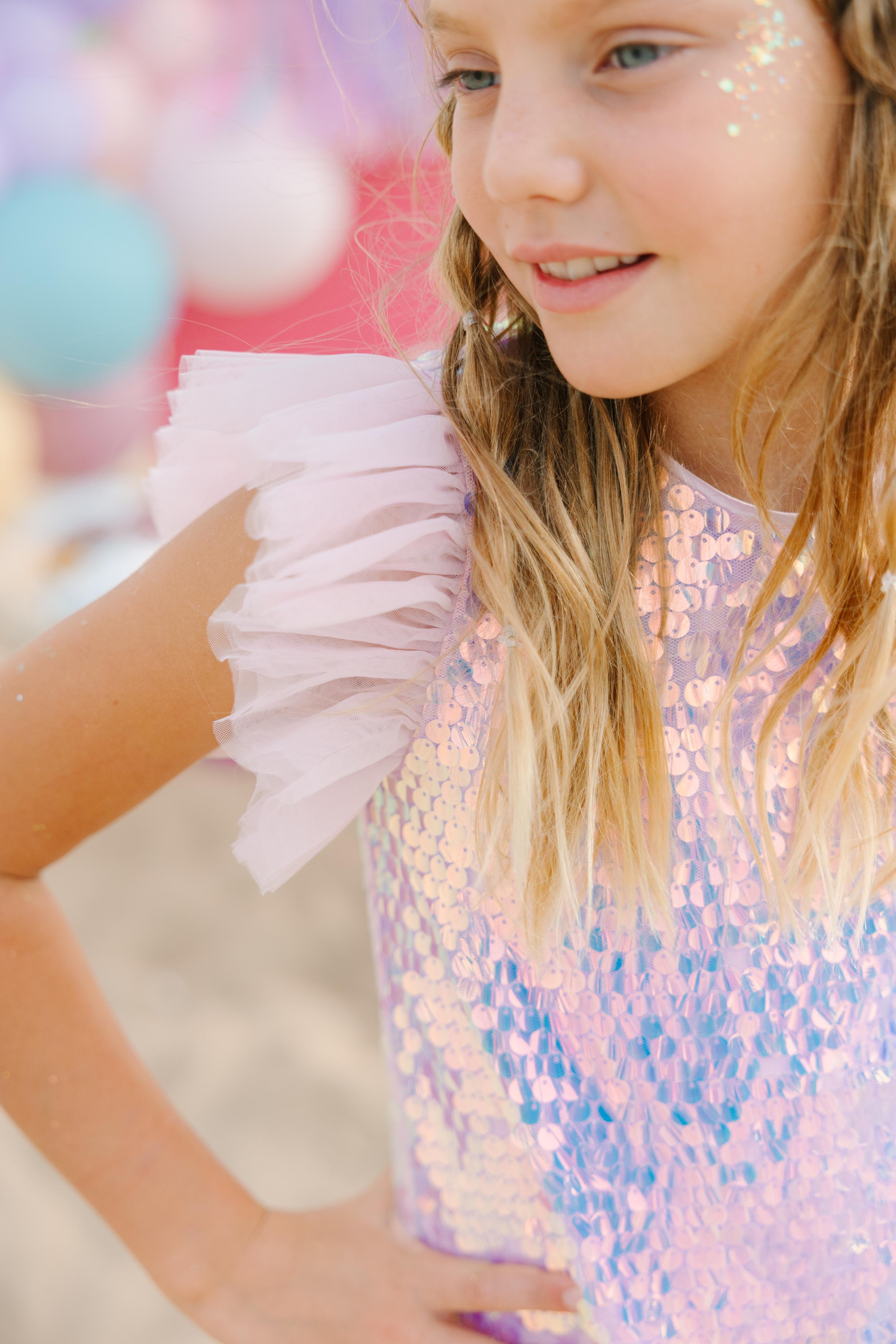 Every star deserves her spotlight, and the Birthday Girl Dress is made for just that. This dazzling piece shimmers with every twirl, featuring iridescent sequins that catch the light beautifully from every angle. Perfect for birthdays, celebrations, or any day she wants to feel extra magical.