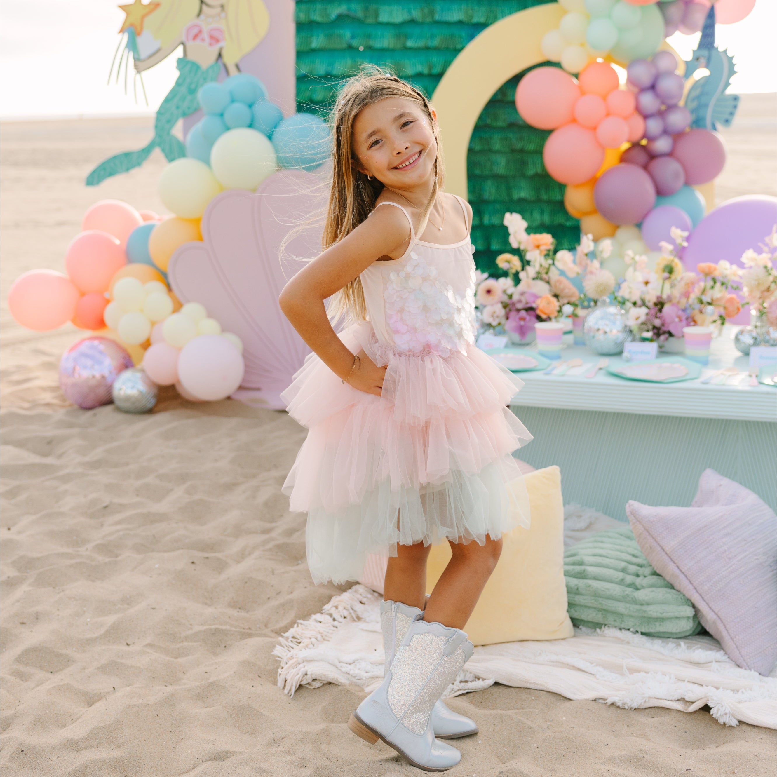 The Mermaid Disco Dress is pure magic—soft, sparkly, and made for girls who believe in mermaids, dance parties, and fairy tales. With shimmering iridescent sequins and layers of twirly tulle, this dress brings the fun of a seaside celebration and the glow of a starlit dance floor.